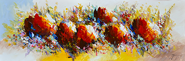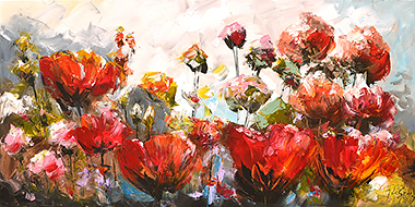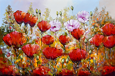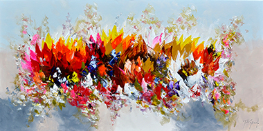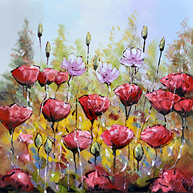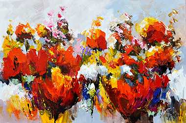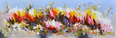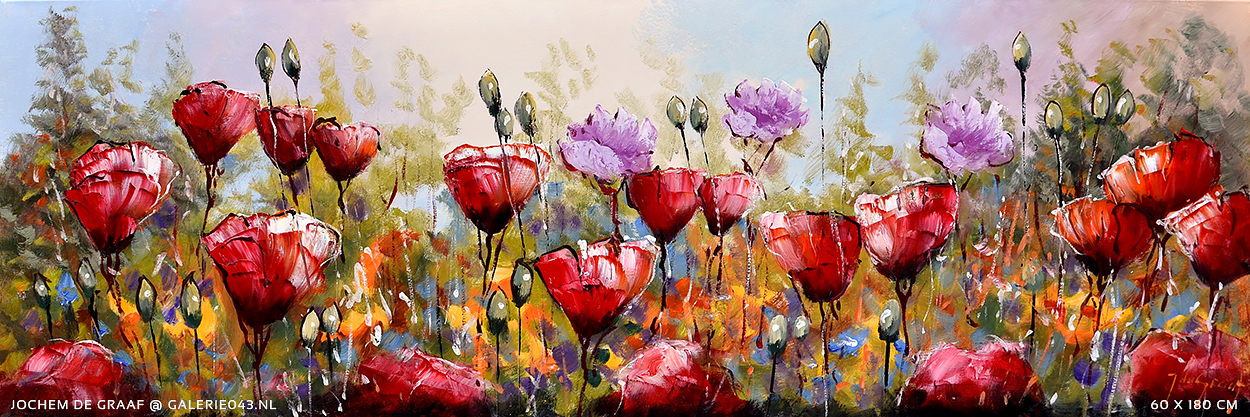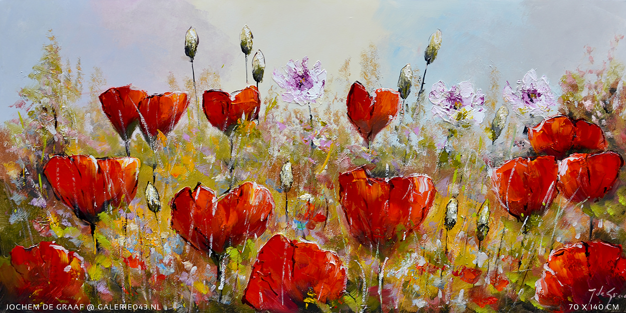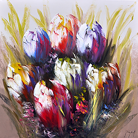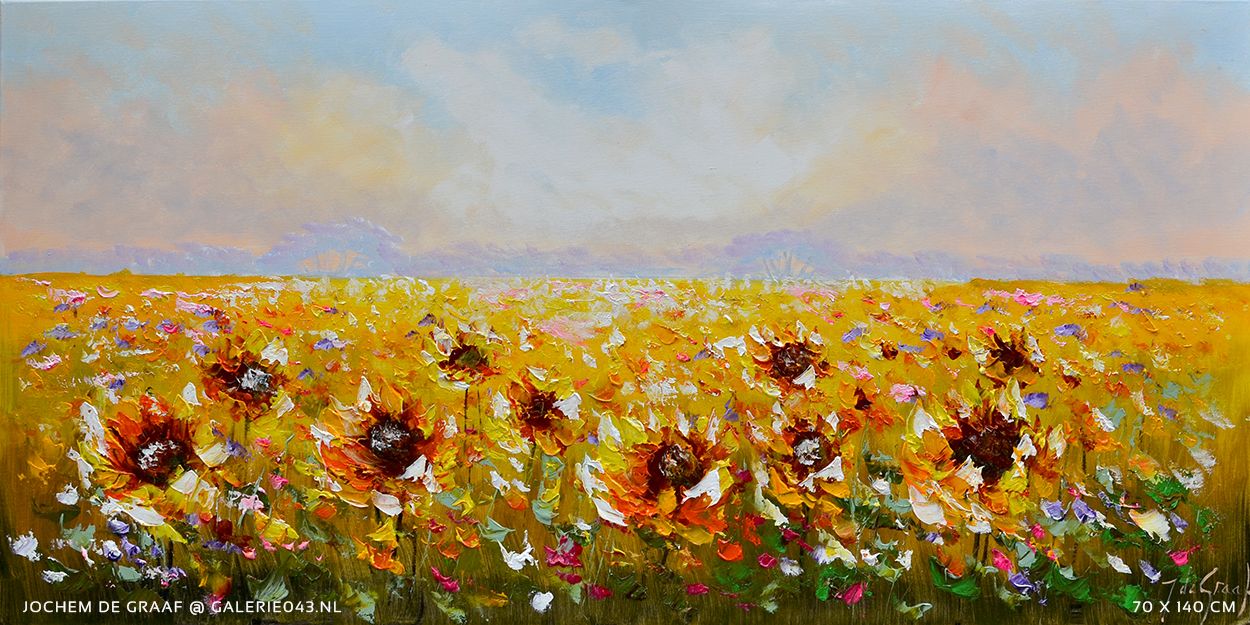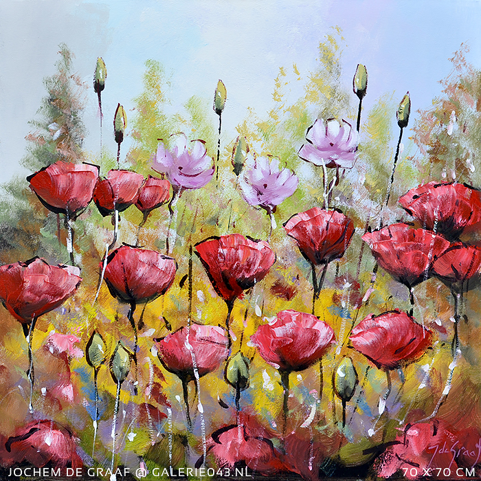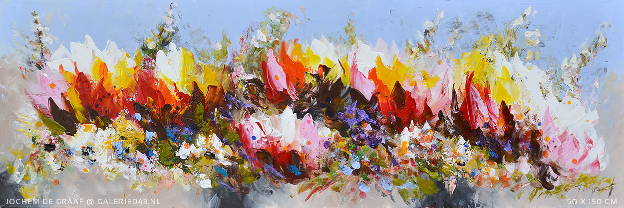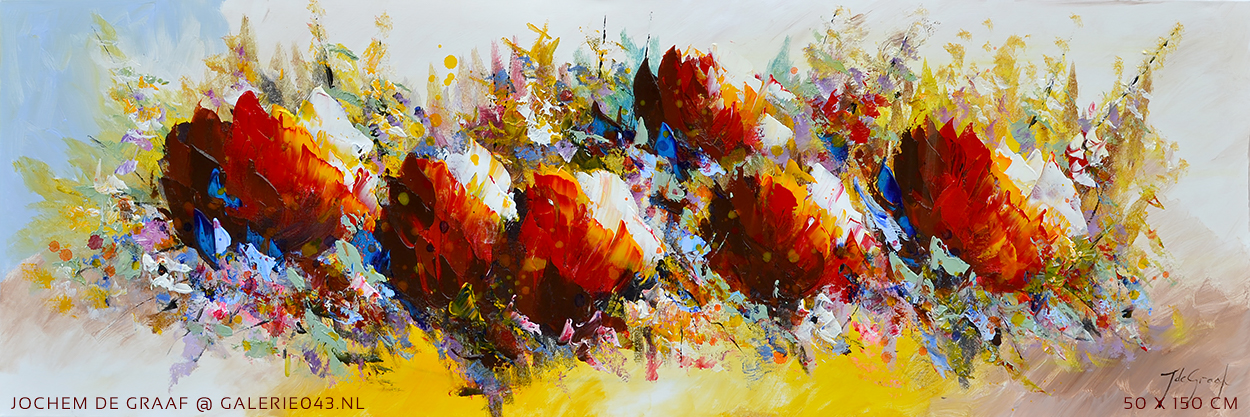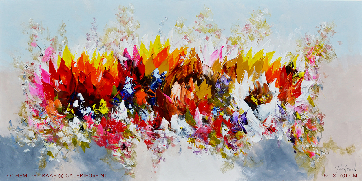 Jochem de Graaf (1954) woont en werkt in de omgeving van Amersfoort. Schilderen is al sinds jaren zijn grote passie. Jochem is autodidact en werd in het begin van zijn schildersloopbaan vooral geïnspireerd door 'mensen' die hij abstract neerzette op zijn doeken. Zijn manier van werken en de materialen die hij voor zijn schilderijen gebruikt geven zijn werk een extra dimensie. Met name het reliëf creëert veel diepte dat bij de inval van licht prachtige schaduwen veroorzaakt. Nog steeds zijn 'mensen' in Jochem's werk een belangrijk thema, maar ook bloemen zijn langzaam maar zeker niet meer weg te denken in zijn oeuvre. Of het nu veldbloemen, Mannequins, anemonen of zonnebloemen zijn: elke variant wordt daar Jochem moeiteloos en vlot vertaald naar bonte of natuurlijk gekleurde schilderijen. Ook hier zijn de door hem gebruikte technieken en materialen (verdikkingspasta, plamuurmes, dik penseel en spatel) de basis van een olieverfschilderij dat spreekwoordelijk 'leeft'.